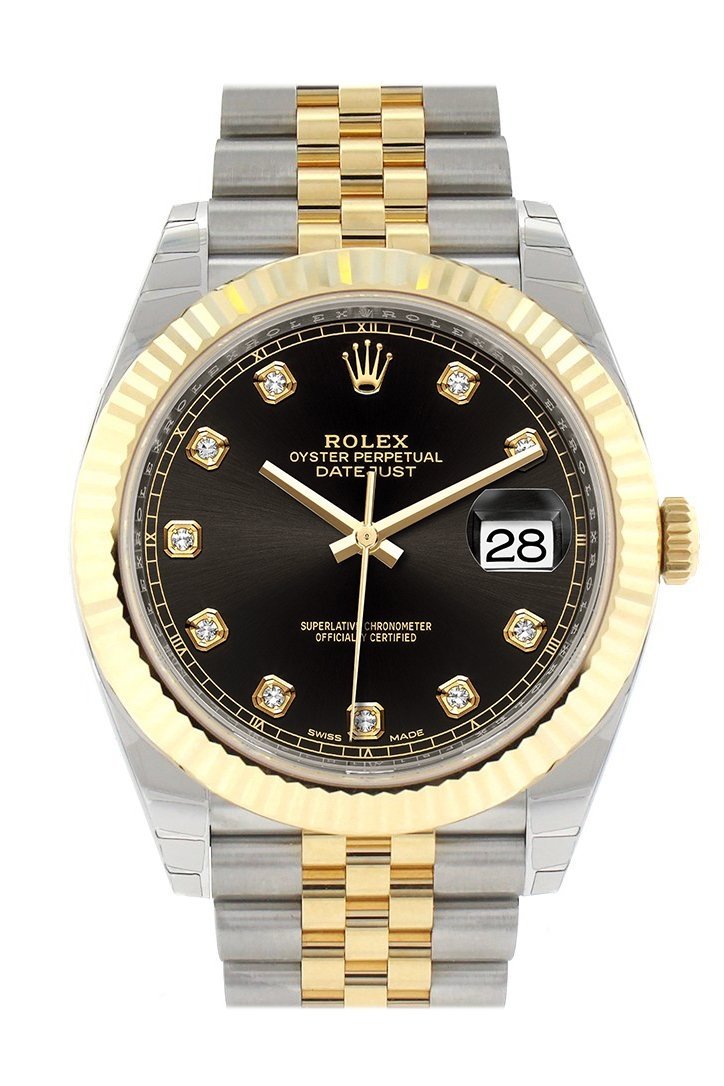 Stainless steel and 18k yellow gold case with a stainless steel and 18k yellow gold Rolex Jubilee bracelet. Fixed 18k yellow gold fluted bezel. Black dial with yellow gold-tone hands and diamond hour markers. Dial Type: Analog. Date display at the 3 o'clock position. Automatic movement. Scratch resistant sapphire crystal. Screw down crown. Solid case back. Case size: 41 mm. Round case shape. Concealed crown clasp. Water resistant at 100 meters / 330 feet. Functions: date, hour, minute, second. Luxury watch style. Watch label: Swiss Made. Rolex Datejust 41 Black Diamond Steel and 18K Yellow Gold Jubilee Mens Watch 126333