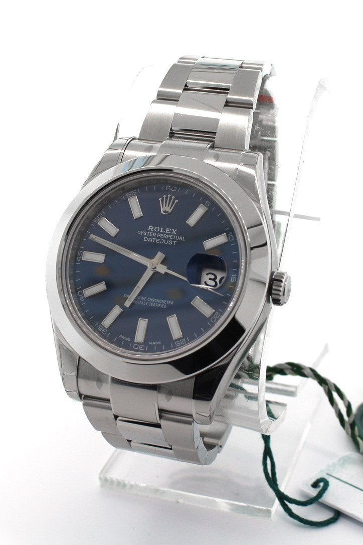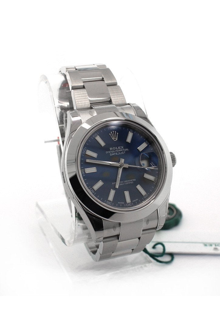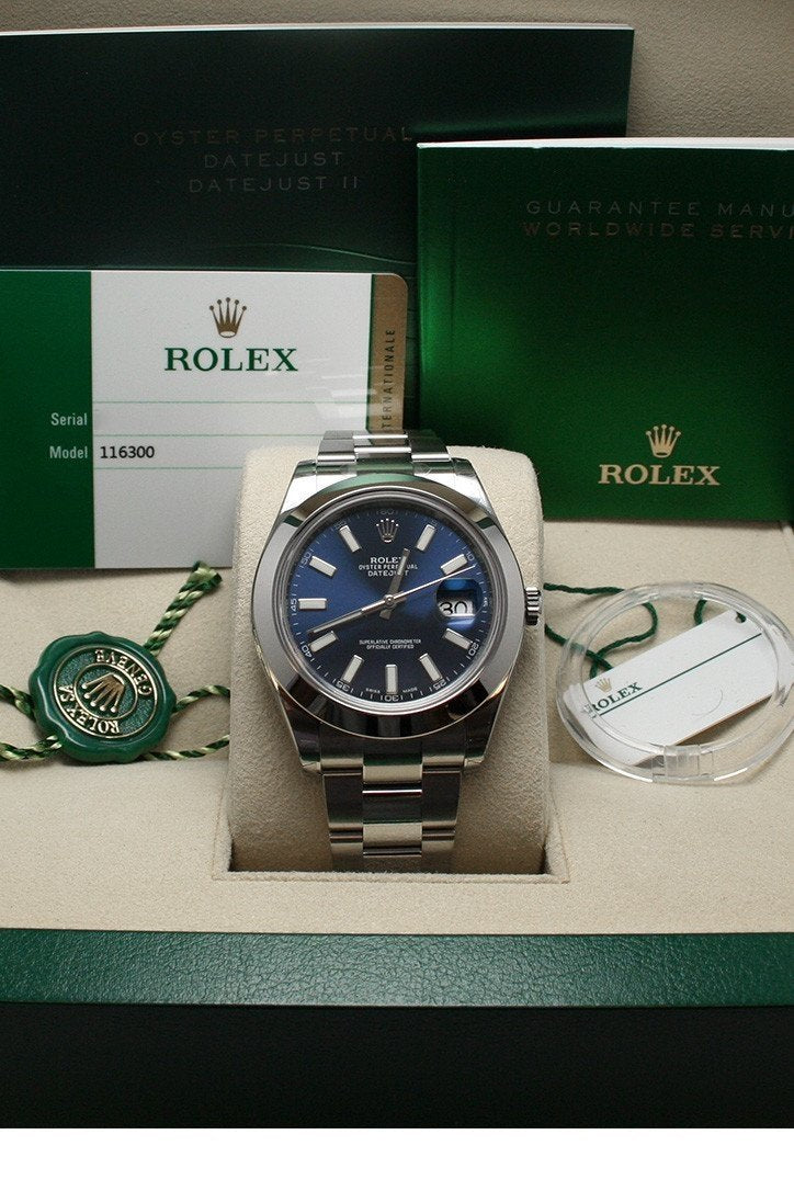 Stainless steel case with a stainless steel oyster bracelet. Domed fixed bezel. Blue dial with luminous hands and index hour markers. Minute markers around the outer rim. Dial Type: Analog. Luminescent hands and markers. Date display at the 3 o'clock position. Automatic movement. Scratch resistant sapphire crystal. Screw down crown. Solid case back. Case diameter: 41 mm. Round case shape. Oyster clasp. Water resistant at 100 meters / 330 feet. Functions: date, hour, minute, second. Luxury watch style. Watch label: Swiss Made. Rolex Datejust II Blue Dial Stainless Steel Automatic Men's Watch. 116300