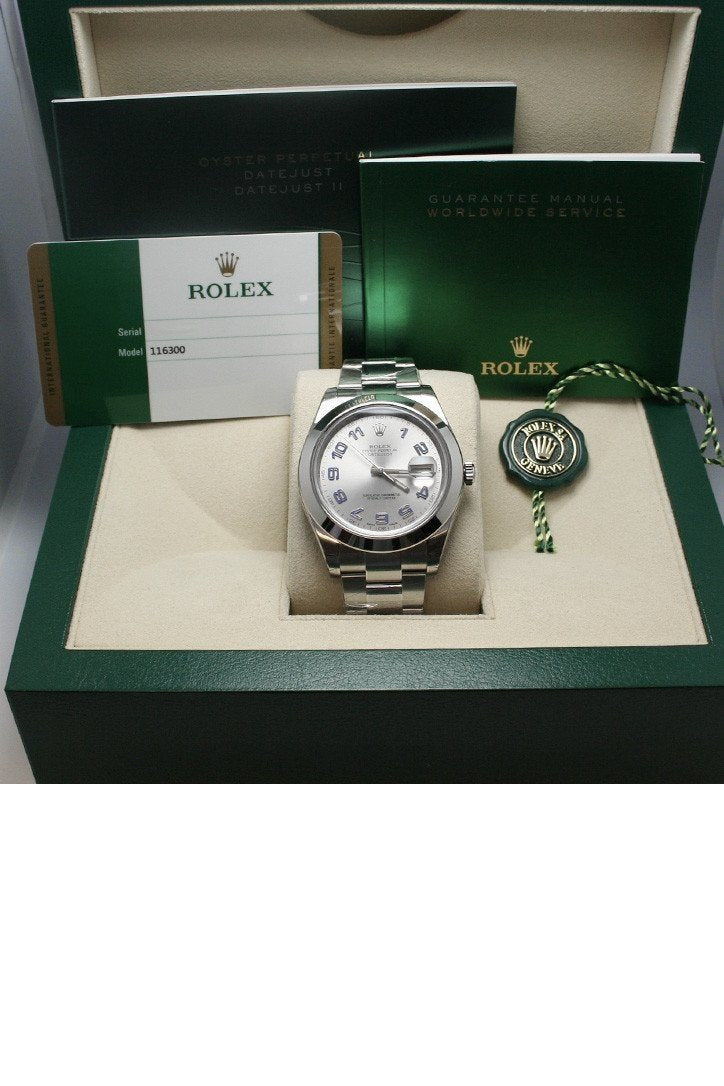 Stainless steel case with a stainless steel oyster bracelet. Domed fixed bezel. Rhodium dial with luminous hands and blue Arabic hour markers. Minute markers around the outer rim. Dial Type: Analog. Luminescent hands and markers. Date display at the 3 o'clock position. Automatic movement. Scratch resistant sapphire crystal. Screw down crown. Solid case back. Case diameter: 41 mm. Round case shape. Oyster clasp. Water resistant at 100 meters / 330 feet. Functions: date, hour, minute, second. Luxury watch style. Watch label: Swiss Made. Rolex Datejust II Rhodium Dial Stainless Steel Automatic Men's Watch. 116300