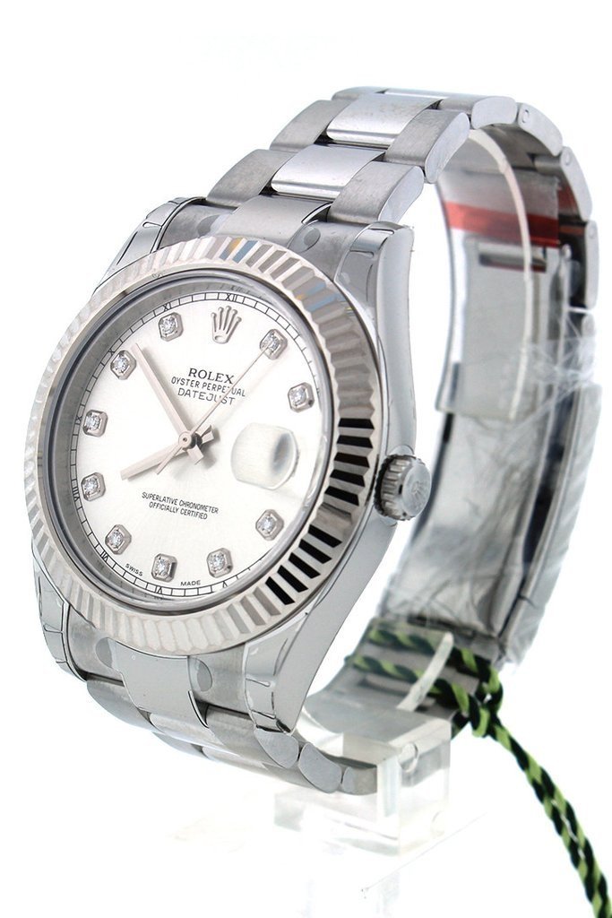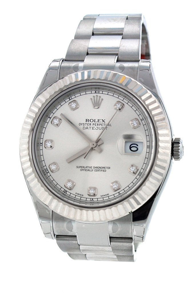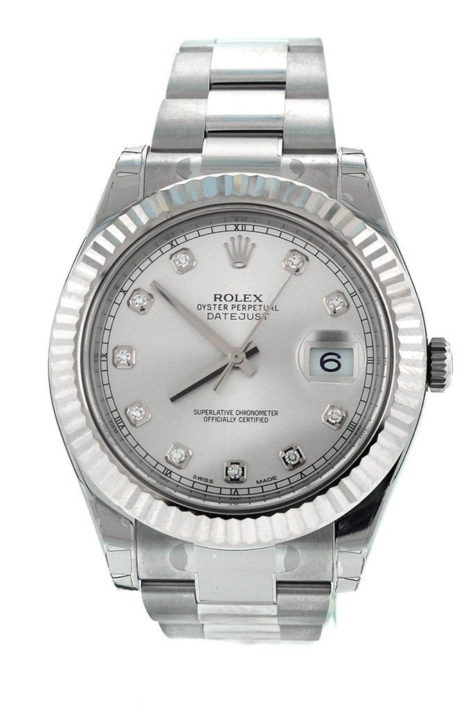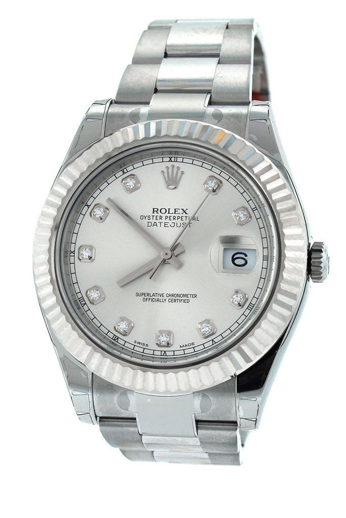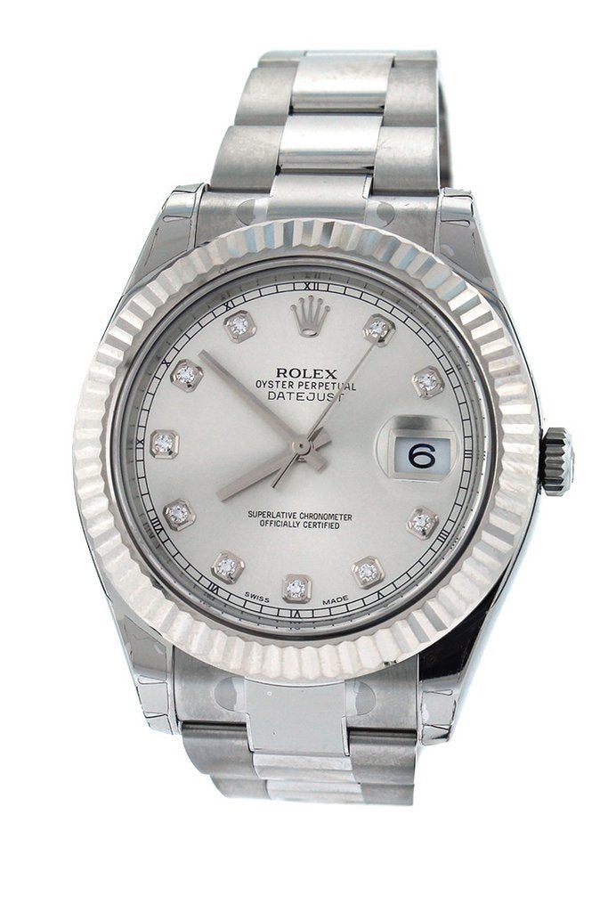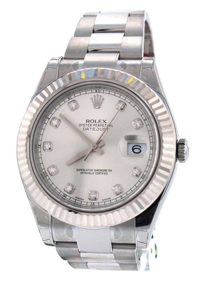 Stainless steel case with a stainless steel oyster bracelet. Fluted 18kt white gold bezel. Silver dial with silver tone hands and diamond hour markers. Minute markers around the outer rim. Date displays at the 3 o'clock position. Self-winding movement. Scratch resistant sapphire crystal. Solid case back. Case diameter: 41 mm. Water resistant at 100 meters/330 feet. Functions: hours, minutes, seconds, date. Rolex Datejust II Silver Diamond Dial 18k White Gold Fluted Bezel Oyster Bracelet Mens Watch 116334