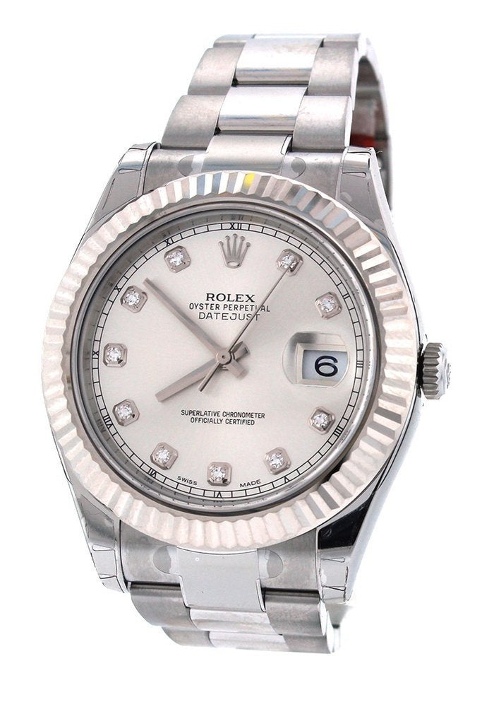 • ROLEX Datejust II 41 Steel Silver Diamond Dial 18kt White Gold Fluted Bezel Men's Watch 116334