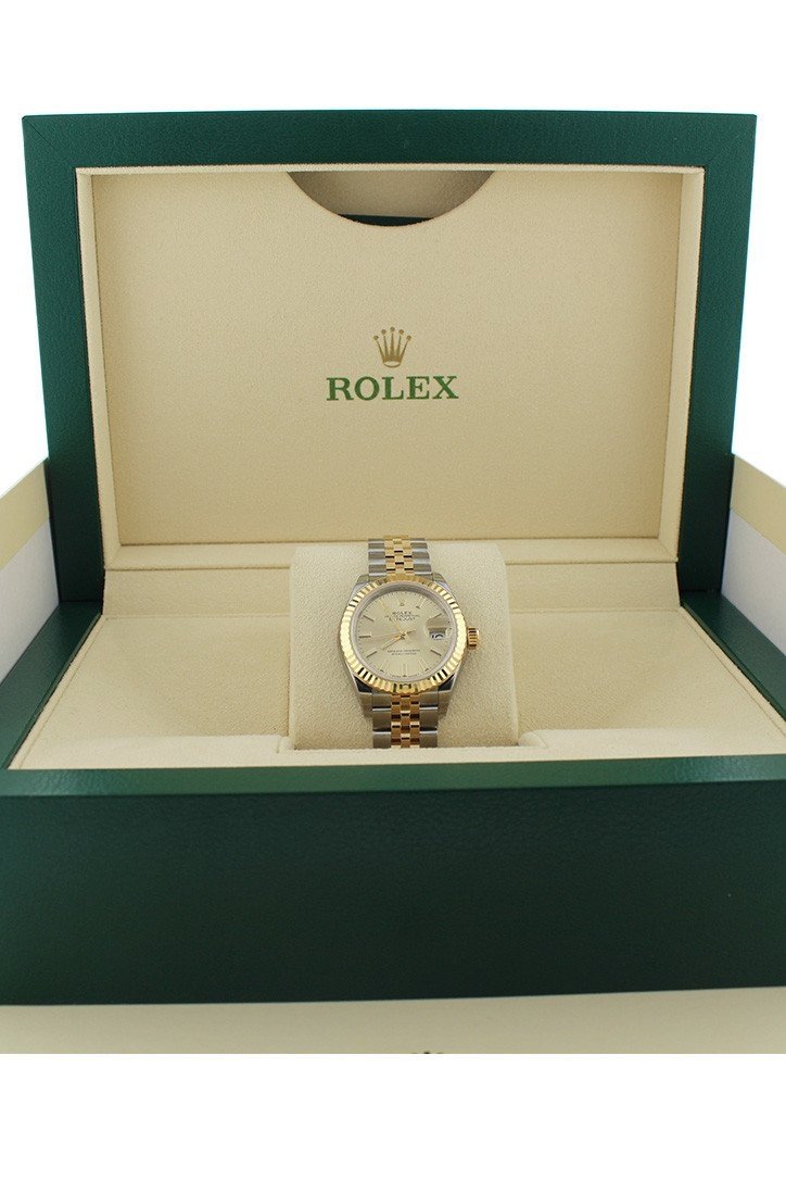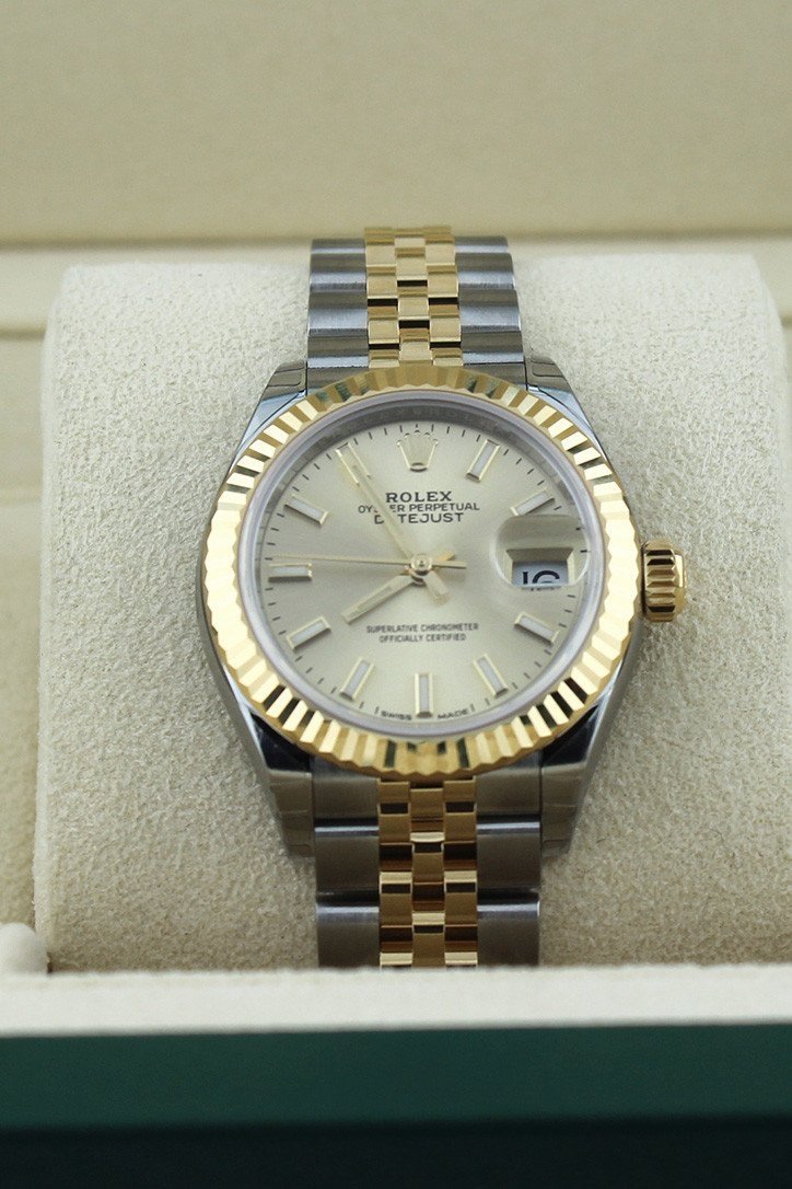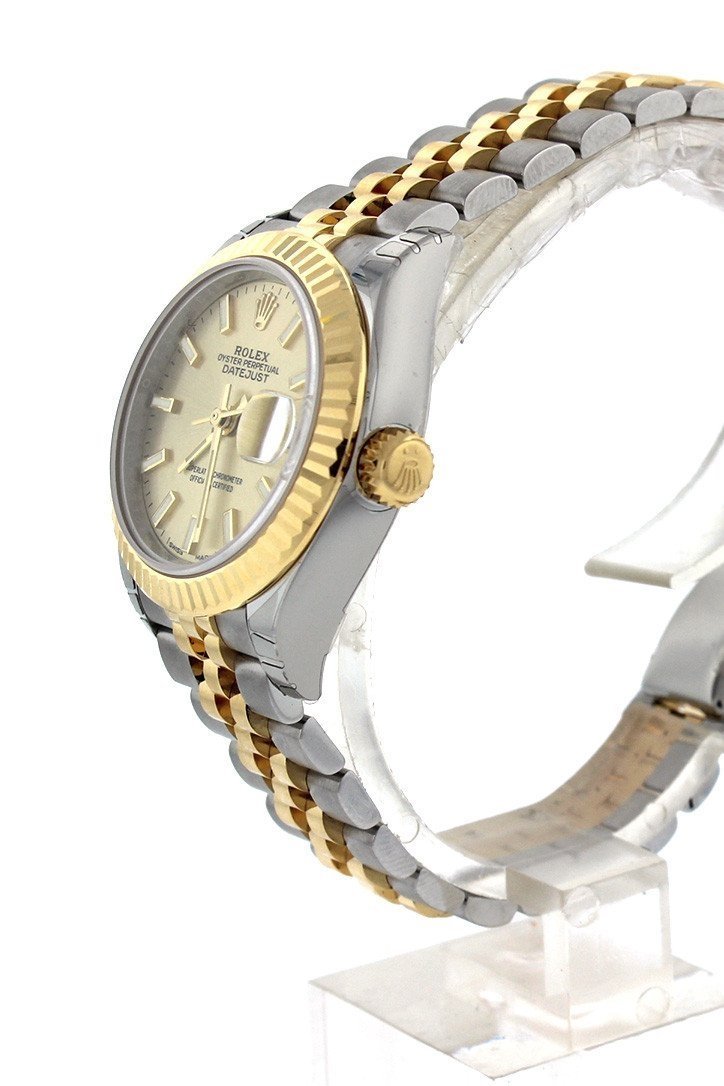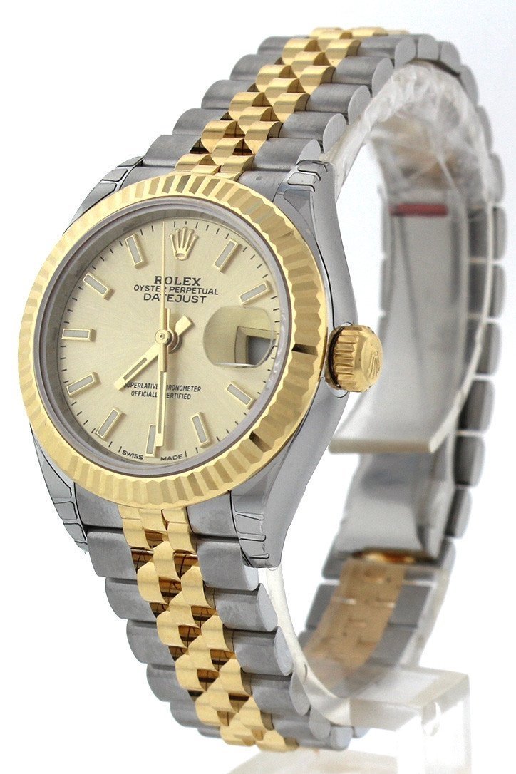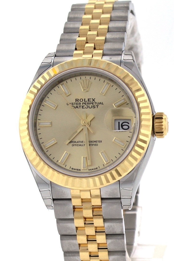 Stainless steel case with a stainless steel and 18kt yellow gold rolex jubilee bracelet. Fixed fluted 18kt yellow gold bezel. Champagne dial with luminous yellow gold-tone hands and index hour markers. Minute markers around the outer rim. Dial Type: Analog. Luminescent hands and markers. Date display at the 3 o'clock position. Rolex Calibre 2236 automatic movement with about 55 hours of power reserve. Scratch resistant sapphire crystal. Screw down crown. Solid case back. Case size: 28 mm. Round case shape. Concealed crown clasp. Water resistant at 100 meters / 330 feet. Functions: date, hour, minute, second. Luxury watch style. Watch label: Swiss Made. Rolex Lady Datejust Champagne Dial Steel and 18K Yellow Gold Automatic Watch 279173