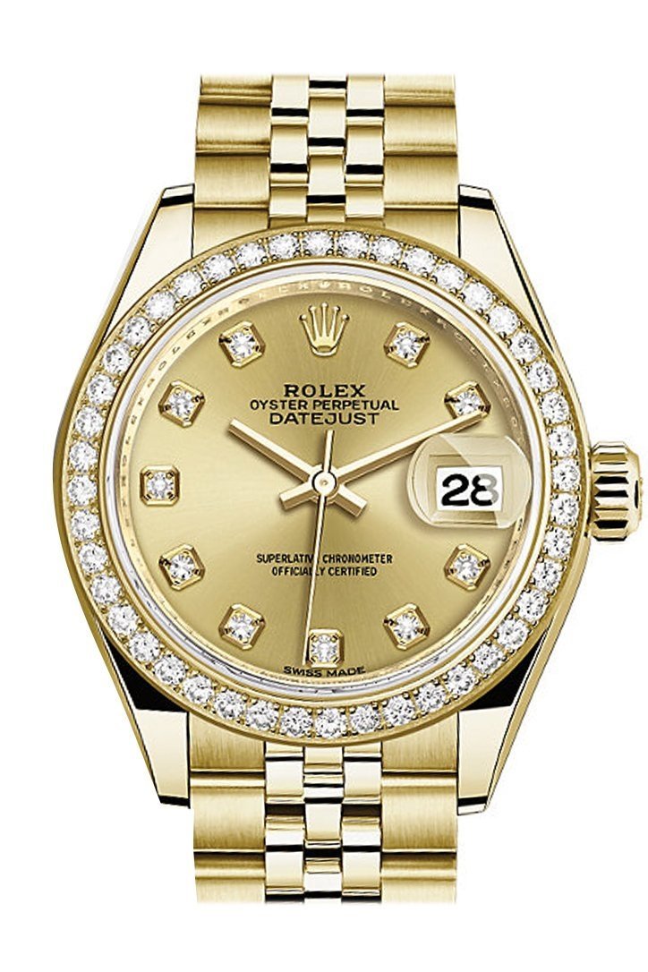 18K yellow gold oyster case with a gold rolex jubilee bracelet. Diamond bezel. Champagne dial with silver-tone hands and roman hour markers. Dial Type: Analog. Date display at the 3 o'clock position. Rolex Calibre 2236 automatic movement. Scratch resistant sapphire crystal. Screw down crown. Solid case back. Case size: 28 mm. Round case shape. Water resistant at 100 meters / 330 feet. Functions: date, hour, minute, second. Luxury watch style. Watch label: Swiss Made. Rolex Lady-Datejust Champagne Dial Automatic Ladies jubilee Watch 279138RBR