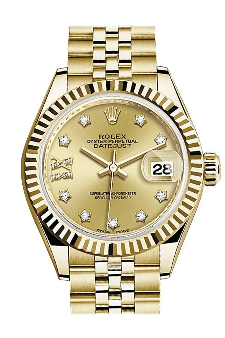 18K yellow gold oyster case with a gold rolex Jubilee bracelet. fluted bezel. Champagne dial with silver-tone hands and 9 diamonds set in star hour markers. Dial Type: Analog. Date display at the 3 o'clock position. Rolex Calibre 2236 automatic movement. Scratch resistant sapphire crystal. Screw down crown. Solid case back. Case size: 28 mm. Round case shape. Water resistant at 100 meters / 330 feet. Functions: date, hour, minute, second. Luxury watch style. Watch label: Swiss Made. Rolex Lady-Datejust Champagne Dial Automatic Ladies President Watch 279178
