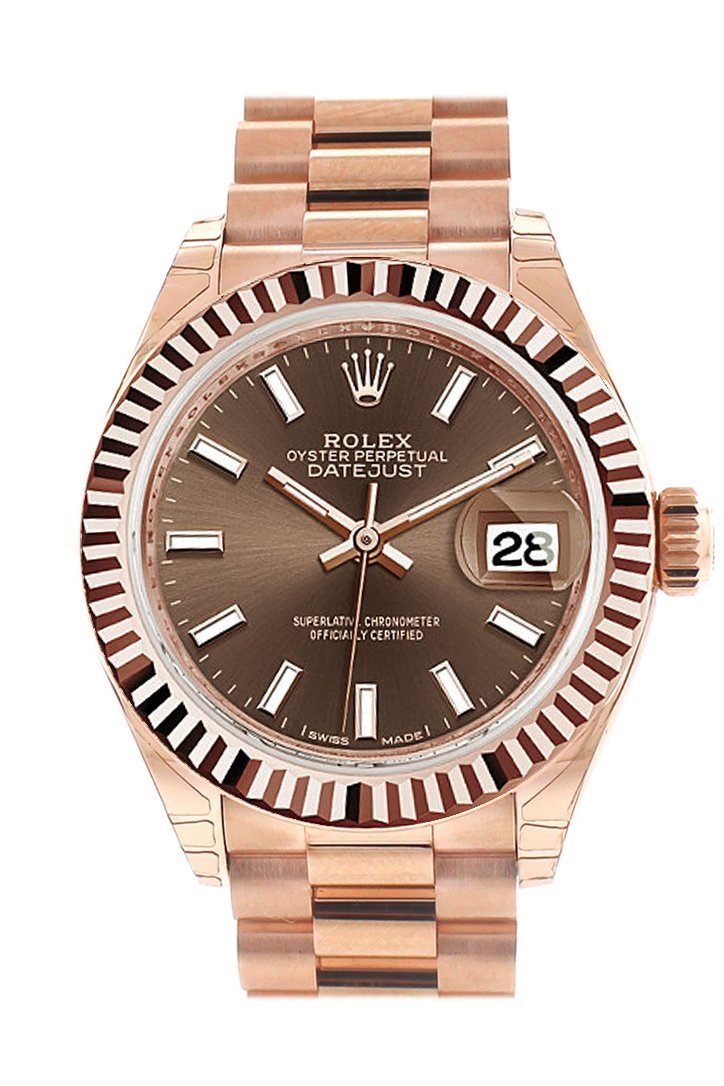18k everose gold case with a 18k everose gold Rolex President bracelet. Fixed - Fluted 18k everose gold bezel. Chocolate dial with rose-gold tone hands and index hour markers. Minute markers around the outer rim. Dial Type: Analog. Date display at the 3 o'clock position. Automatic movement. Scratch resistant sapphire crystal. Screw down crown. Solid case back. Case diameter: 28 mm. Round case shape. Concealed Crown clasp. Water resistant at 100 meters / 330 feet. Functions: date, hour, minute, second. Luxury watch style. Watch label: Swiss Made. Rolex Lady-Datejust 28 Chocolate Dial 18K Everose Gold President Automatic Ladies Watch 279165