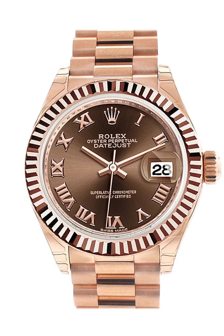 18k everose gold case with a 18k everose gold Rolex President bracelet. Fixed - Fluted 18k everose gold bezel. Chocolate dial with rose-gold tone hands and Roman hour markers. Minute markers around the outer rim. Dial Type: Analog. Date display at the 3 o'clock position. Automatic movement. Scratch resistant sapphire crystal. Screw down crown. Solid case back. Case diameter: 28 mm. Round case shape. Concealed Crown clasp. Water resistant at 100 meters / 330 feet. Functions: date, hour, minute, second. Luxury watch style. Watch label: Swiss Made. Rolex Lady-Datejust 28 Chocolate Dial 18K Everose Gold President Automatic Ladies Watch 279165