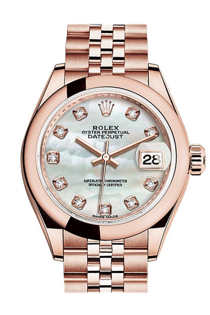 18k everose gold case with a 18k everose gold Rolex Jubilee bracelet. Fixed - domed 18k everose gold bezel. Mother of Pearl dial with rose-gold tone hands and Diamond hour markers. Minute markers around the outer rim. Dial Type: Analog. Date display at the 3 o'clock position. Automatic movement. Scratch resistant sapphire crystal. Screw down crown. Solid case back. Case diameter: 28 mm. Round case shape. Concealed Crown clasp. Water resistant at 100 meters / 330 feet. Functions: date, hour, minute, second. Luxury watch style. Watch label: Swiss Made. Rolex Lady-Datejust 28 Mother of Pearl Green Dial 18K Everose Gold Jubilee Automatic Ladies Watch 279165