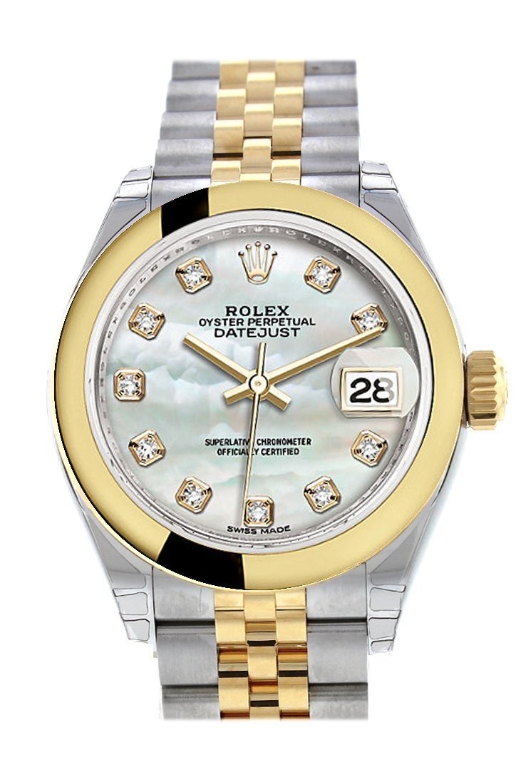 Stainless steel and 18k yellow gold case with a stainless steel and 18kt yellow gold rolex jubilee bracelet. Fixed bezel. Mother of Pearl dial with gold-tone hands and Diamond numeral hour markers. Dial Type: Analog. Date display at the 3 o'clock position. Rolex Calibre 2236 automatic movement with about 55 hours of power reserve. Scratch resistant sapphire crystal. Screw down crown. Solid case back. Case size: 28 mm. Round case shape. Water resistant at 100 meters / 330 feet. Functions: date, hour, minute, second. Luxury watch style. Watch label: Swiss Made. Rolex Lady Datejust 28 Mother of Pearl Dial Automatic Two Tone Jubilee Watch 279163