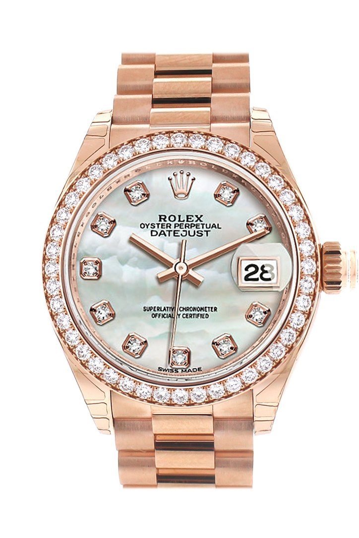 Stainless steel case with a stainless steel and 18kt everose gold Rolex oyster President. Fixed fluted 18kt everose gold bezel. Pearl dial with everose gold-tone hands and Diamond hour markers. Dial Type: Analog. Date display at the 3 o'clock position. Rolex calibre 2236 automatic movement with a 55-hour power reserve. Scratch resistant sapphire crystal. Screw down crown. Solid case back. Case size: 28 mm. Round case shape. Oysterlock clasp. Water resistant at 100 meters / 330 feet. Functions: date, hour, minute, second, chronometer. Luxury watch style. Watch label: Swiss Made. Rolex Lady Datejust Pearl Dial Automatic Ladies Watch 279135RBR