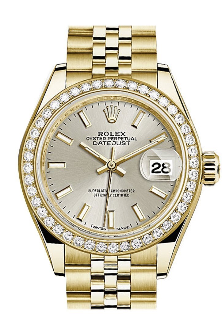 18K yellow gold oyster case with a gold rolex jubilee bracelet. Diamond bezel. Silver dial with silver-tone hands and roman hour markers. Dial Type: Analog. Date display at the 3 o'clock position. Rolex Calibre 2236 automatic movement. Scratch resistant sapphire crystal. Screw down crown. Solid case back. Case size: 28 mm. Round case shape. Water resistant at 100 meters / 330 feet. Functions: date, hour, minute, second. Luxury watch style. Watch label: Swiss Made. Rolex Lady-Datejust Silver Dial Automatic Ladies jubilee Watch 279138RBR