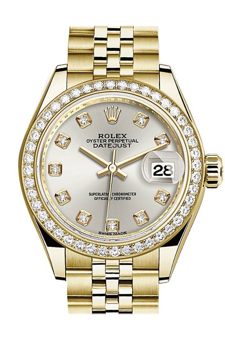 18K yellow gold oyster case with a gold rolex jubilee bracelet. Diamond bezel. Silver dial with silver-tone hands and diamond hour markers. Dial Type: Analog. Date display at the 3 o'clock position. Rolex Calibre 2236 automatic movement. Scratch resistant sapphire crystal. Screw down crown. Solid case back. Case size: 28 mm. Round case shape. Water resistant at 100 meters / 330 feet. Functions: date, hour, minute, second. Luxury watch style. Watch label: Swiss Made. Rolex Lady-Datejust Silver Dial Automatic Ladies jubilee Watch 279138RBR