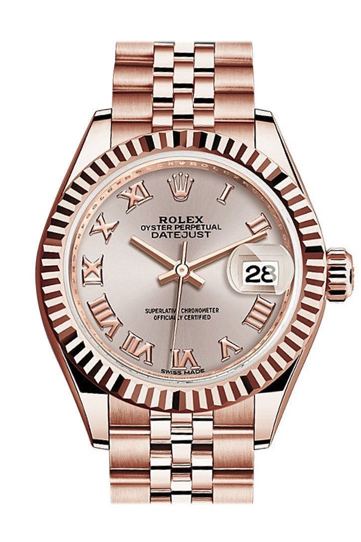 18k everose gold case with a 18k everose gold Rolex Jubilee bracelet. Fixed - Fluted 18k everose gold bezel. Sundust dial with rose-gold tone hands and Roman hour markers. Minute markers around the outer rim. Dial Type: Analog. Date display at the 3 o'clock position. Automatic movement. Scratch resistant sapphire crystal. Screw down crown. Solid case back. Case diameter: 28 mm. Round case shape. Concealed Crown clasp. Water resistant at 100 meters / 330 feet. Functions: date, hour, minute, second. Luxury watch style. Watch label: Swiss Made. Rolex Lady-Datejust 28 Sundust Dial 18K Everose Gold Jubilee Automatic Ladies Watch 279165