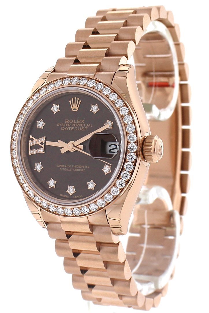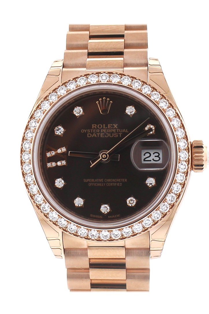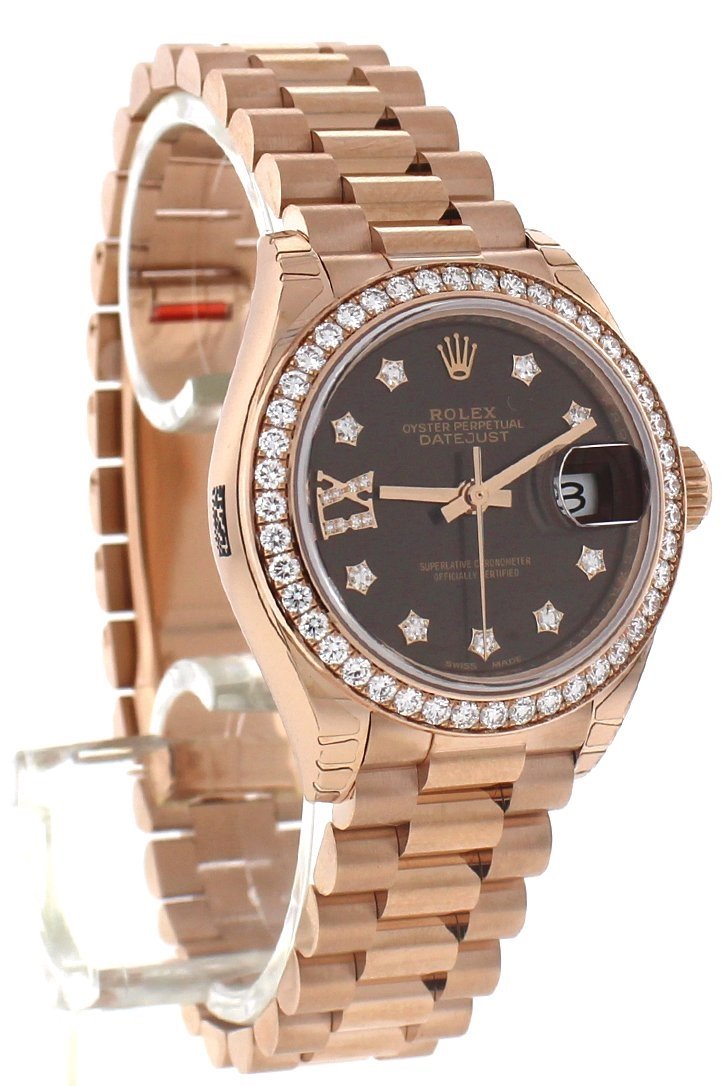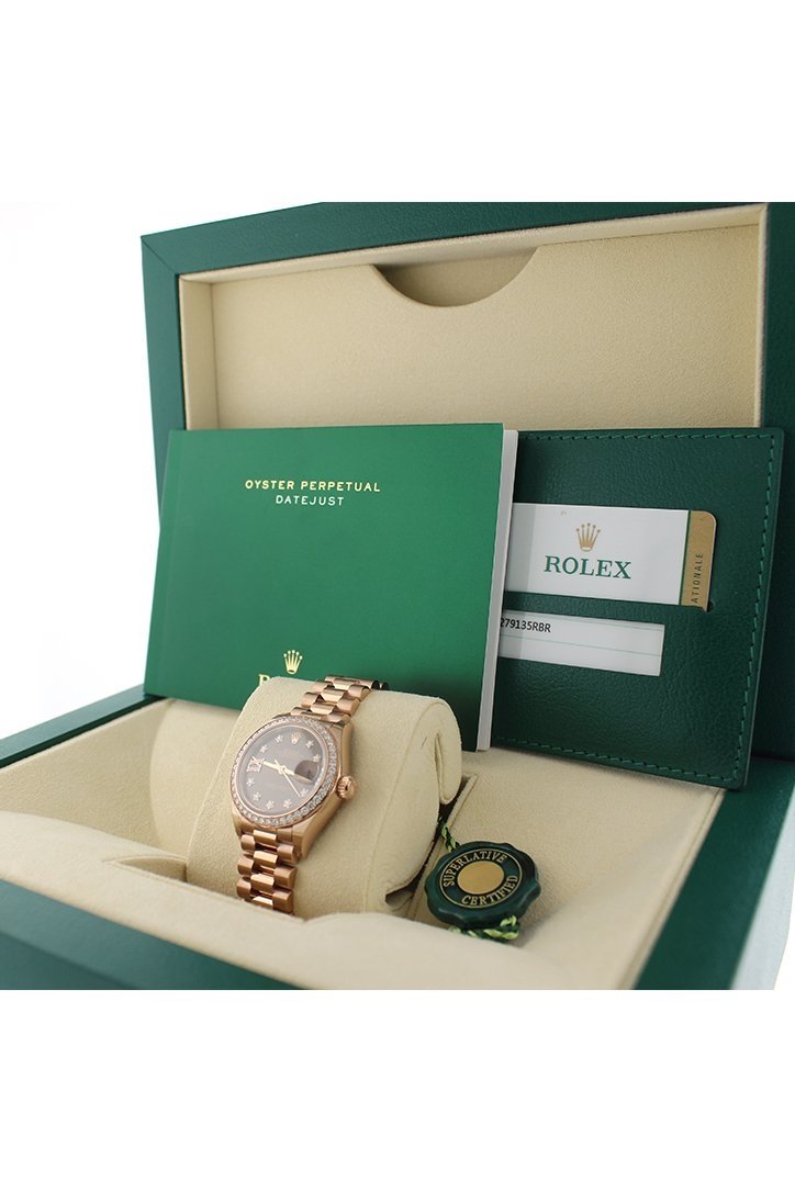 18k everose gold case with a 18k everose gold Rolex President bracelet. Fixed - 18k everose gold diamond-set bezel. Chocolate dial with rose-gold tone hands and diamond hour markers. Diamond-filled roman numeral 9. Dial Type: Analog. Date display at the 3 o'clock position. Automatic movement. Scratch resistant sapphire crystal. Screw down crown. Case diameter: 28 mm. Round case shape. Concealed Crown clasp. Water resistant at 100 meters / 330 feet. Functions: date, hour, minute, second. Luxury watch style. Watch label: Swiss Made. Rolex Lady-Datejust 28 Chocolate Dial 18K Everose Gold President Automatic Ladies Diamond Watch 279135RBR