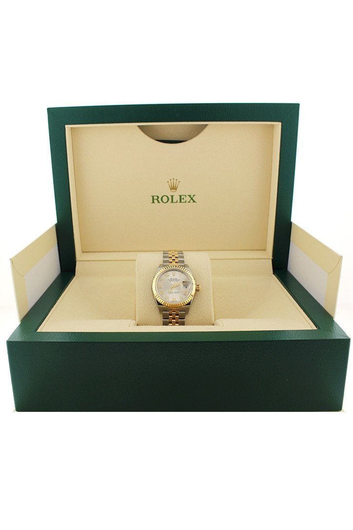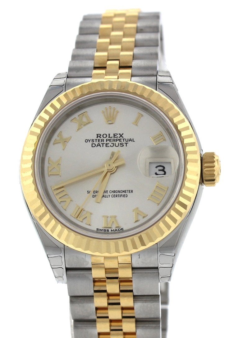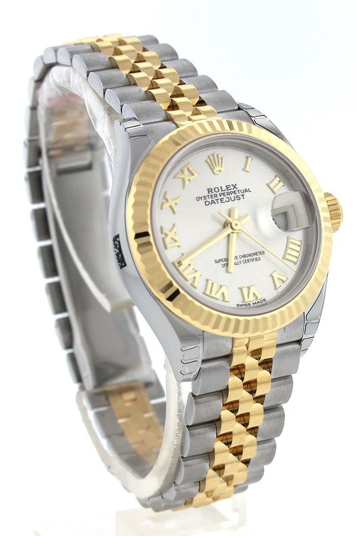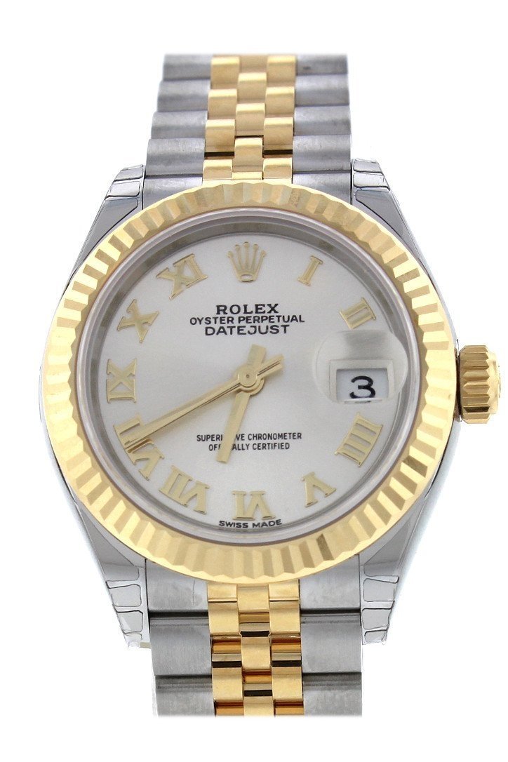 Stainless steel and 18k yellow gold case with a stainless steel and 18k yellow gold Rolex Jubilee bracelet. Fixed - domed 18k yellow gold bezel. Silver dial with yellow gold-tone hands and Roman numeral hour markers. Dial Type: Analog. Date display at the 3 o'clock position. Rolex Calibre 2236 automatic movement with about 55 hours of power reserve. Scratch resistant sapphire crystal. Screw down crown. Solid case back. Case size: 28 mm. Round case shape. Concealed crown clasp. Water resistant at 100 meters / 330 feet. Functions: date, hour, minute, second. Luxury watch style. Watch label: Swiss Made. Rolex Lady Datejust Silver Dial Steel and 18K Yellow Gold Jubilee Watch 279173