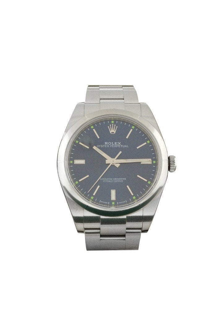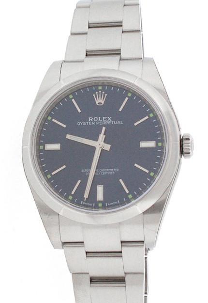 Stainless steel case with a stainless steel Rolex oyster bracelet. Fixed domed stainless steel bezel. Blue dial with silver-tone hands and index hour markers. Minute markers around the outer rim. Dial Type: Analog. Luminescent hands and markers. Automatic movement. Scratch resistant sapphire crystal. Screw down crown. Case diameter: 39 mm. Round case shape. Oysterlock clasp. Water resistant at 100 meters / 330 feet. Functions: hour, minute, second. Luxury watch style. Watch label: Swiss Made. Rolex Oyster Perpetual 39 Blue Dial Stainless Steel Rolex Oyster Automatic Mens Watch. 114300