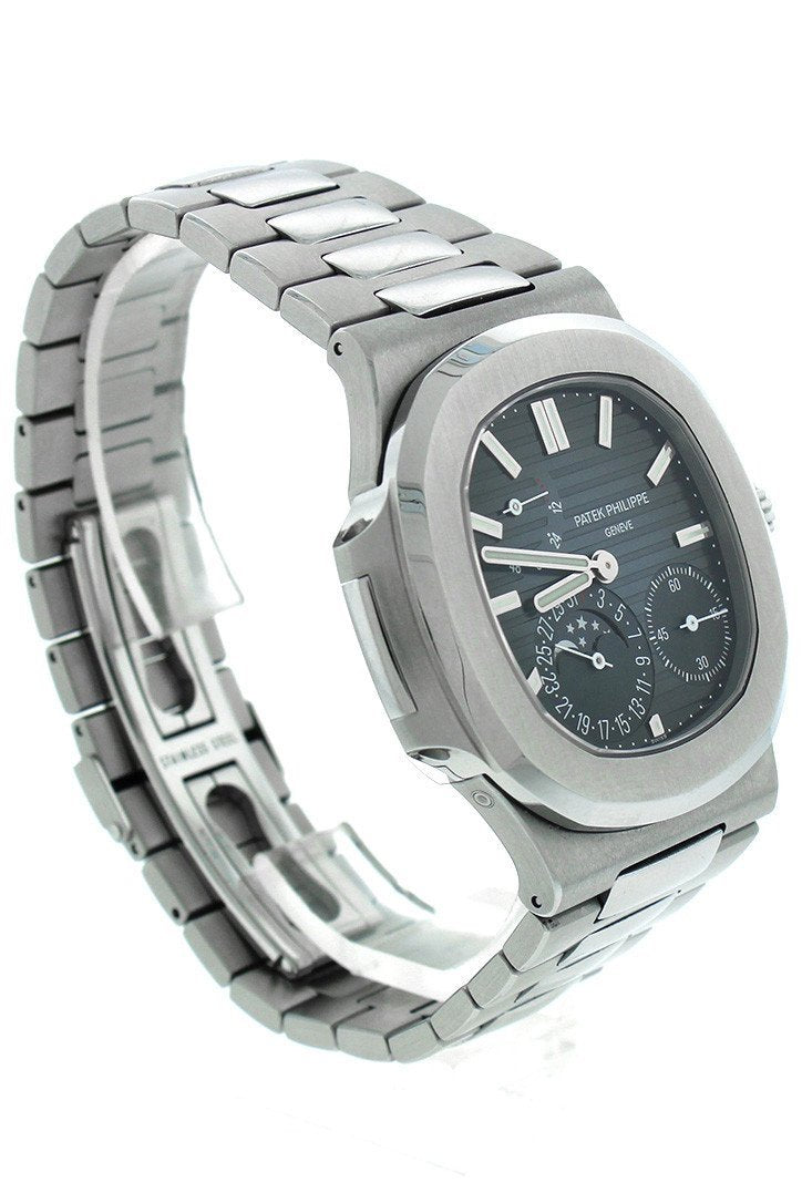 Stainless steel case with a stainless steel bracelet. Fixed bezel. Blue dial. Date at 7 o'clock position. Date, moon-phase, small second, power reserve. Automatic movement. Scratch resistant scratch resistant sapphire crystal. Fluted crown. Case diameter: 40 mm.0 Deployment clasp. Water resistant at 60 meters / 200 feet. Functions: hours, minutes, seconds subdial at 4, moon phases, date, power reserve. Additional Info: hour/minute hands and hour markers in 18k white gold, 48-hour power reserve, date subdial at 7. Patek PhilIPpe Nautilus Mens Watch 5712-1A