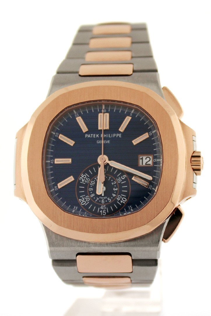 18Kt rose gold case with a stainless steel and 18kt rose gold bracelet. Fixed rose gold bezel. Blue gradient dial with rose gold-tone hands and index hour markers. Minute markers around the outer rim. Dial Type: Analog. Luminescent hands and markers. Date display at the 3 o'clock position. One combination sub-dial at the 6 o'clock position displaying 60 seconds and 12 hours. Automatic mechanical movement. CH 28-520 C engine. Scratch resistant sapphire crystal. Screw down crown. Transparent sapphire case back. Case diameter: 40.5 mm. Round case shape. Deployment fold over clasp. Water resistant at120 meters / 400 feet. Functions: chronograph, date, hour, minute, second. Luxury watch style. Watch label: Swiss Made. Patek Philippe Nautilus Mechanical Blue Dial Mens Watch 5980/1AR