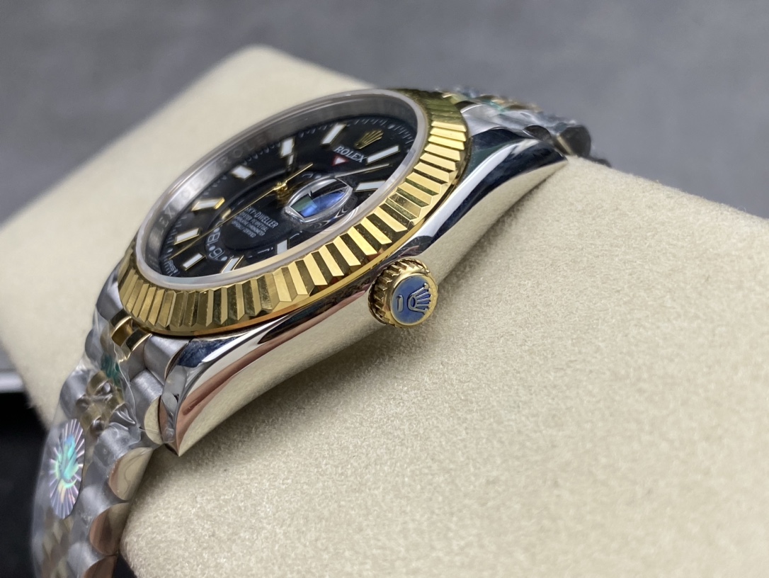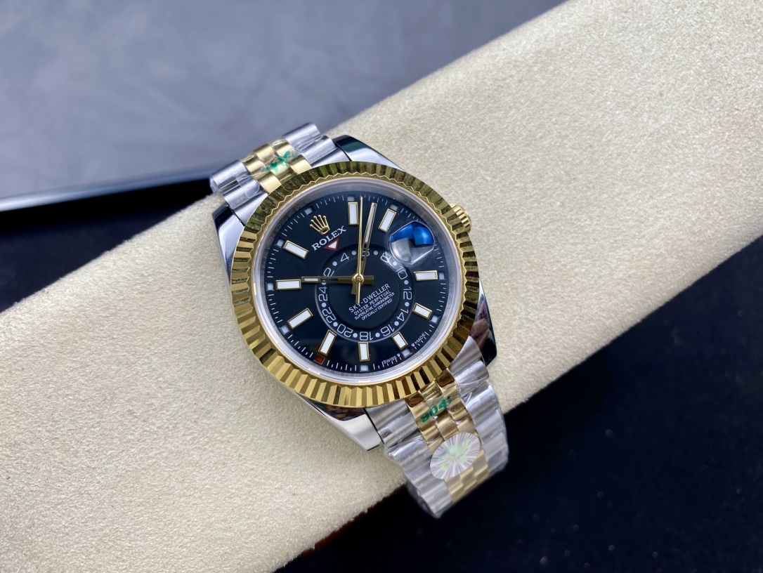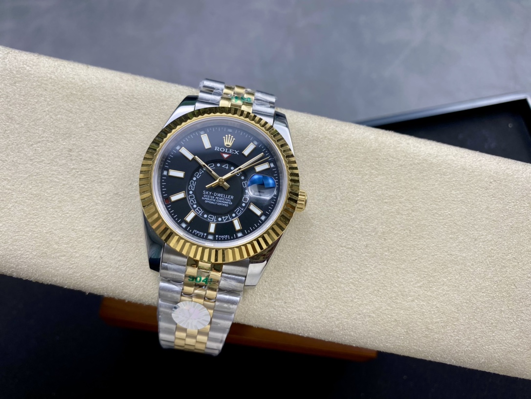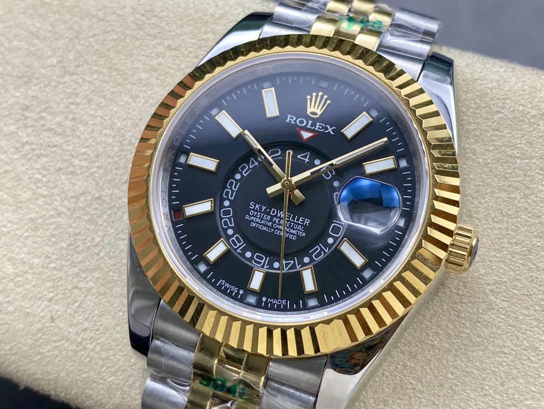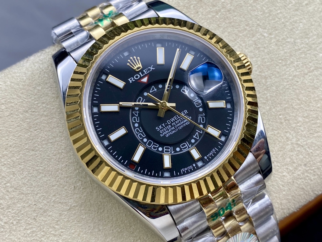 18kt yellow gold case with a two-tone (silver-tone and yellow gold-tone) stainless steel and 18kt yellow gold rolex Jubilee bracelet. Fluted 18kt yellow gold bezel. Black dial with gold-tone hands and index hour markers. Dial Type: Analog. Luminescent hands and markers. Date display at the 3 o'clock position. Rolex Calibre 9001 automatic movement. Scratch resistant sapphire crystal. Screw down crown. Case size: 42 mm. Round case shape. Water resistant at 100 meters / 330 feet. Functions: date, hour, minute, second, dual time. Luxury watch style. Watch label: Swiss Made. Rolex Oyster Perpetual Sky-Dweller Automatic Mens Two-Tone Watch 326933 New Release Model 2021