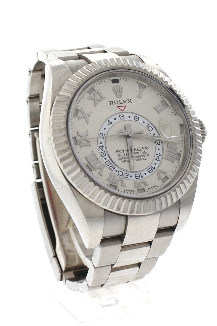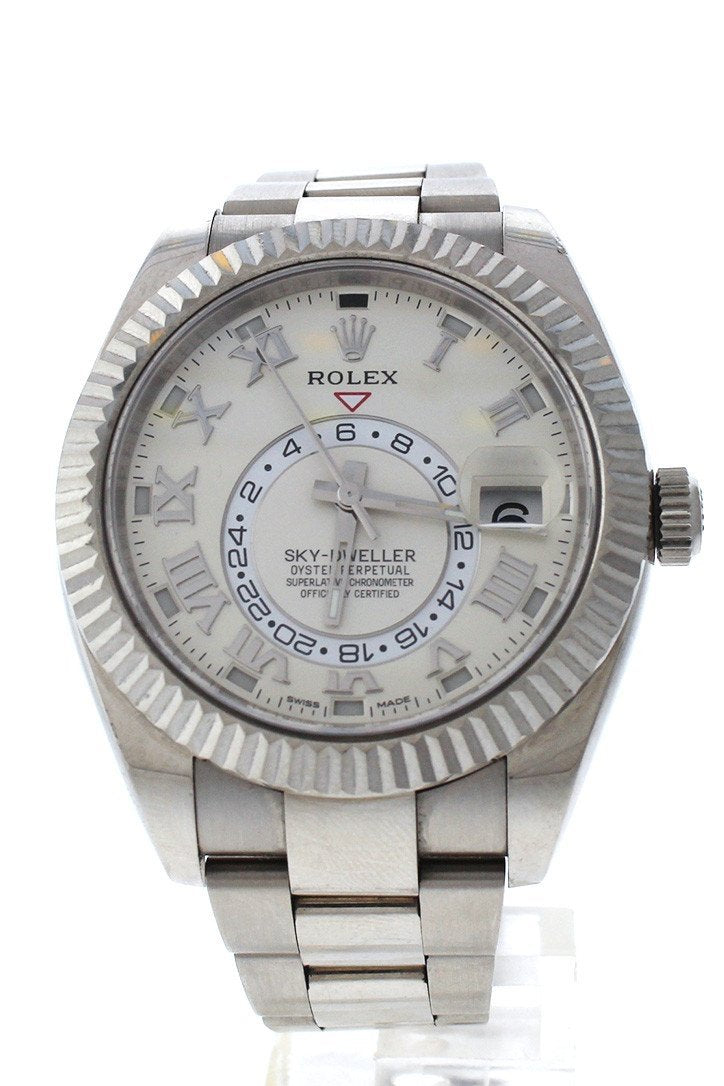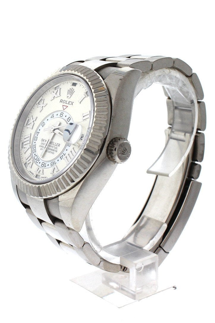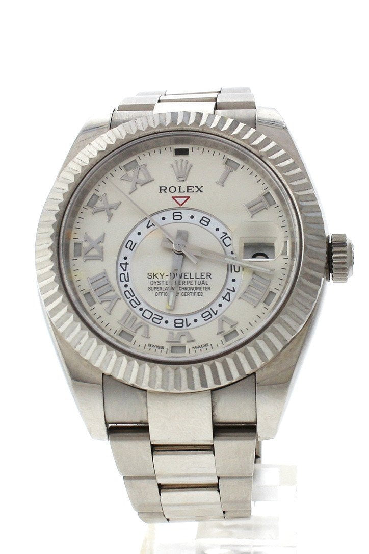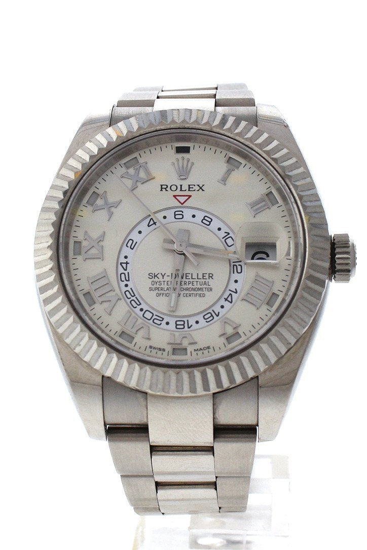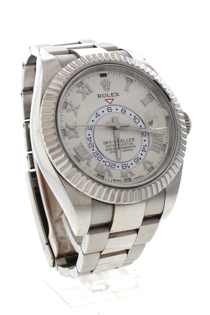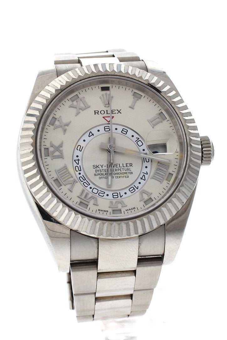 18k white gold case with a 18k white gold rolex oyster bracelet. Bi-directional rotating - 18k white gold bezel. Ivory dial with silver-tone hands and Roman numeral hour markers. Minute markers around the outer rim. Dial Type: Analog. "saros" annual calendar. 24 hour (2nd time zone) rotating disk. Automatic movement. Rolex caliber 9001 engine. Scratch resistant sapphire crystal. Screw down crown. Case diameter: 42 mm. Round case shape. Triple folding clasp. Water resistant at 100 meters / 330 feet. Functions: date, hour, minute, second, GMT. Luxury watch style. Watch label: Swiss Made. Rolex Sky Dweller Ivory Dial 18K White Gold Rolex Oyster Automatic Mens Watch 326939