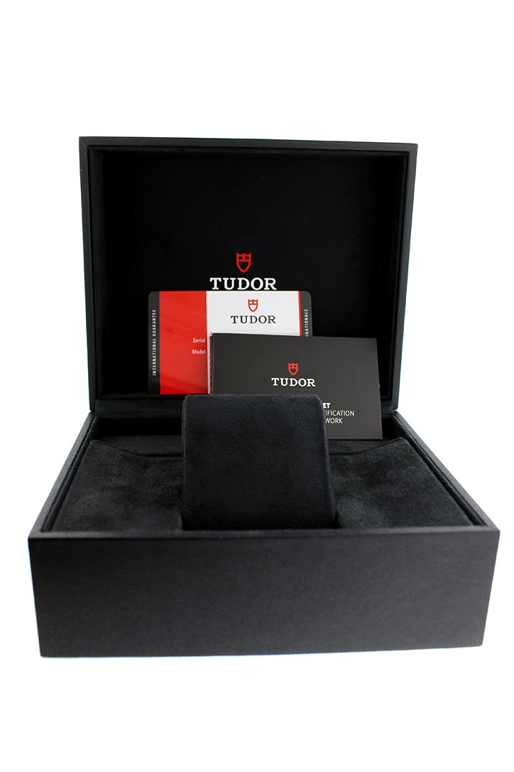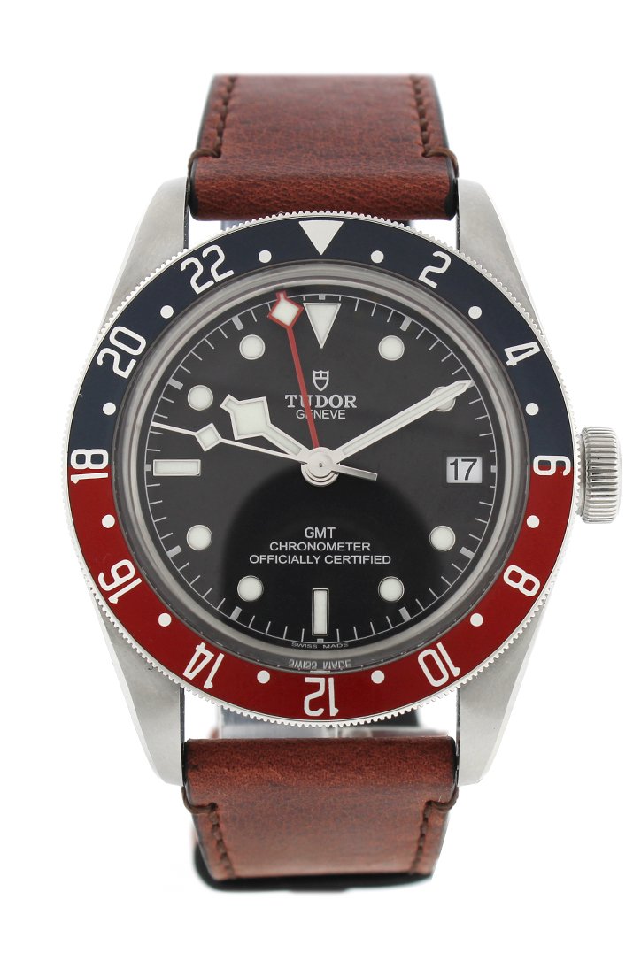 Silver-tone stainless steel case with a brown leather strap. Bi-directional rotating burgundy and blue bezel. Black dial with silver-tone hands and dot hour markers. Dial Type: Analog. Date display at the 3 o'clock position. Tudor Calibre MT5652 automatic movement with a 70-hour power reserve. Scratch resistant sapphire crystal. Screw down crown. Round case shape. Case size: 41 mm. Water resistant at 200 meters / 660 feet. Functions: GMT, second time zone, hour, minute, second, date. Watch label: Swiss Made. Tudor Black Bay Automatic Black Dial Men's GMT Brown Leather Watch