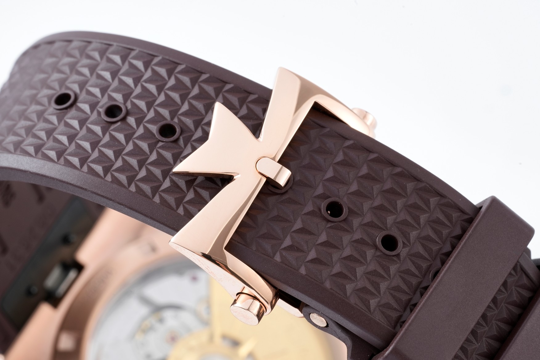 The 41mm 18K rose gold case is highly nuanced with sharp angles and a distinctive polished bezel containing satin-finished plots